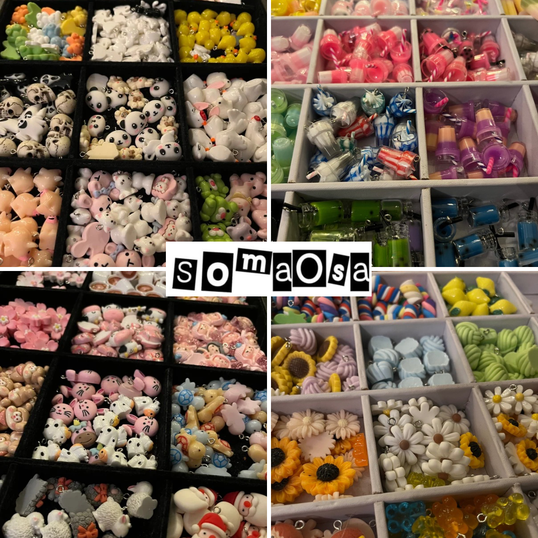Yllätyssekoitus (10 kpl) erilaisia riipuksia. Riipusten koko on noin 1-3 cm riippuen mallista ja muodosta. materiaaleina hartsi ja akryyli. Sopivat erinomaisesti koruihin sekä silmukkamerkkeihin.