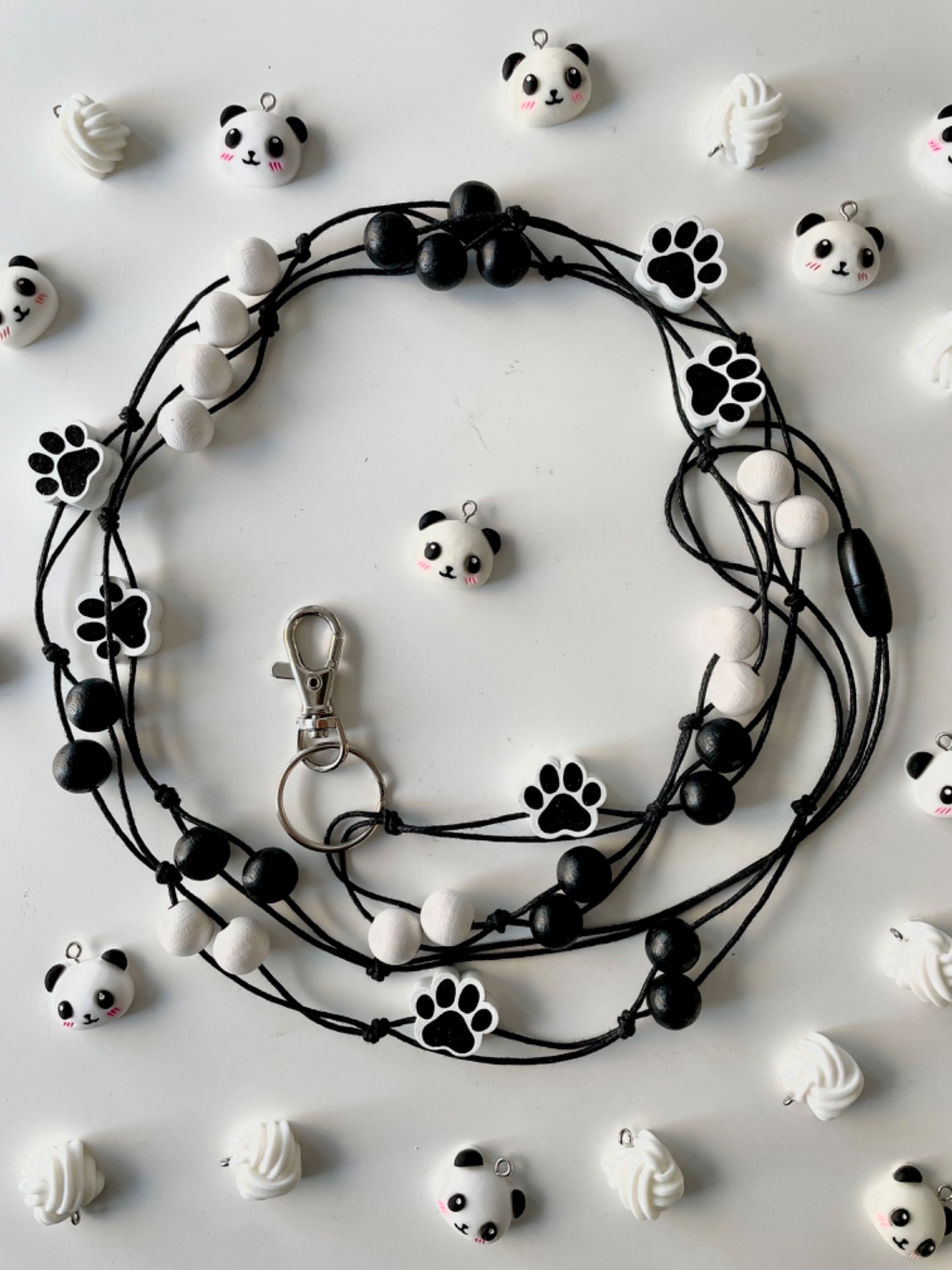 Kaulaan puettava avainkaulakoru. Mustaa ja valkoista Preciosan puuhelmeä sekä lisäksi puisiatassuhelmiä. Ympärysmitta noin 110 cm. Niskassa turvalukko, jonka kautta avainkorua voi tarvittaessa lyhentää.