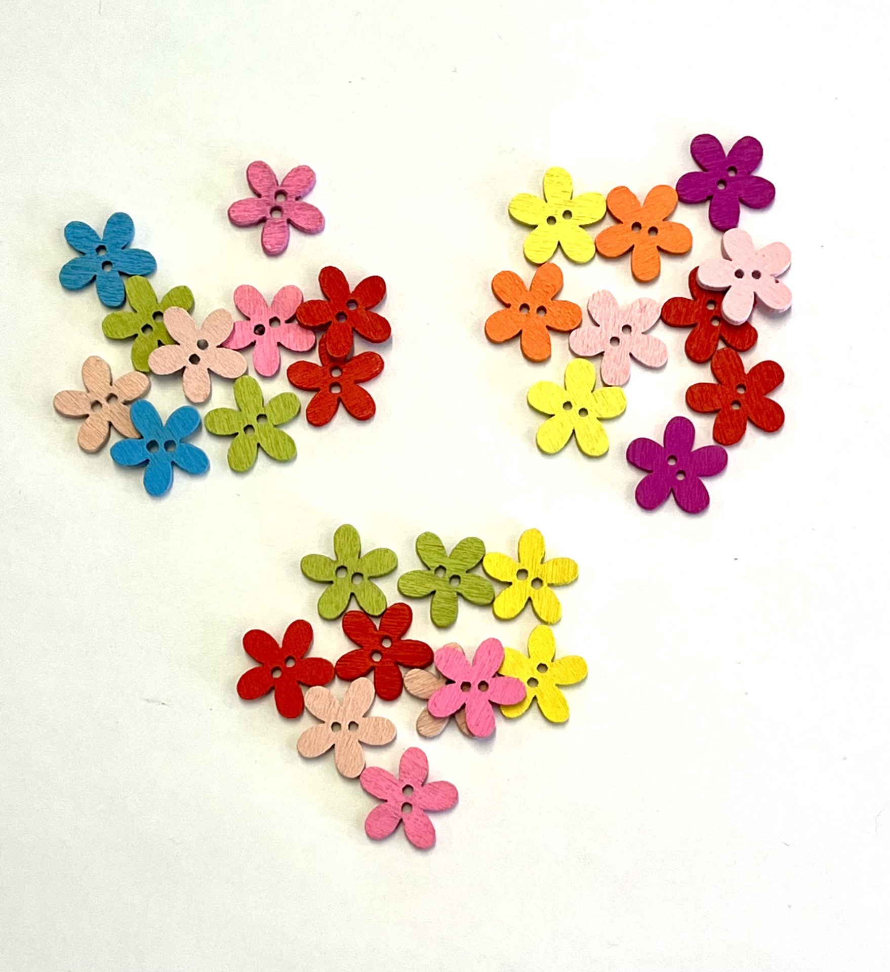 Värisekoitus puisia kukkanappeja. Pakkauksessa 10 kpl.